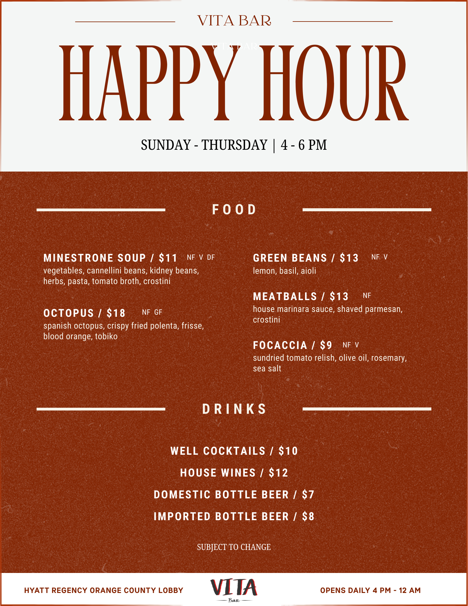 Located in the lobby of Hyatt Regency Orange County, VITA Italian Bar & Grill invites guests to savor a refreshed take on breakfast and dinner, thoughtfully inspired by modern Italian cuisine. Enjoy a chef-crafted meal, and dishes showcasing local ingredients and VITA’s celebrated farm-to-table philosophy. Each plate is prepared with creativity, precision, and refined Italian technique, delivering a vibrant taste of comfort and elegance in every bite.